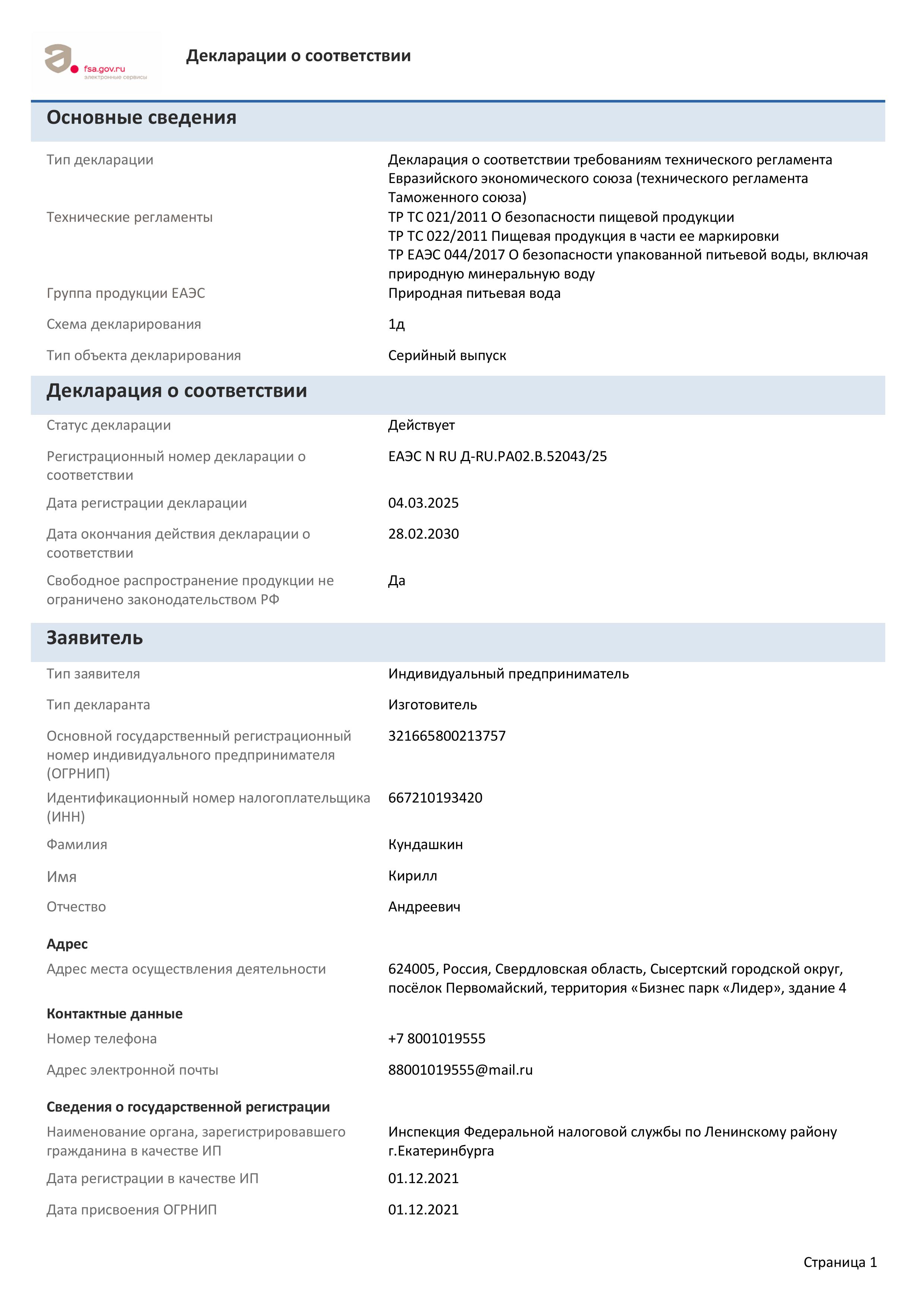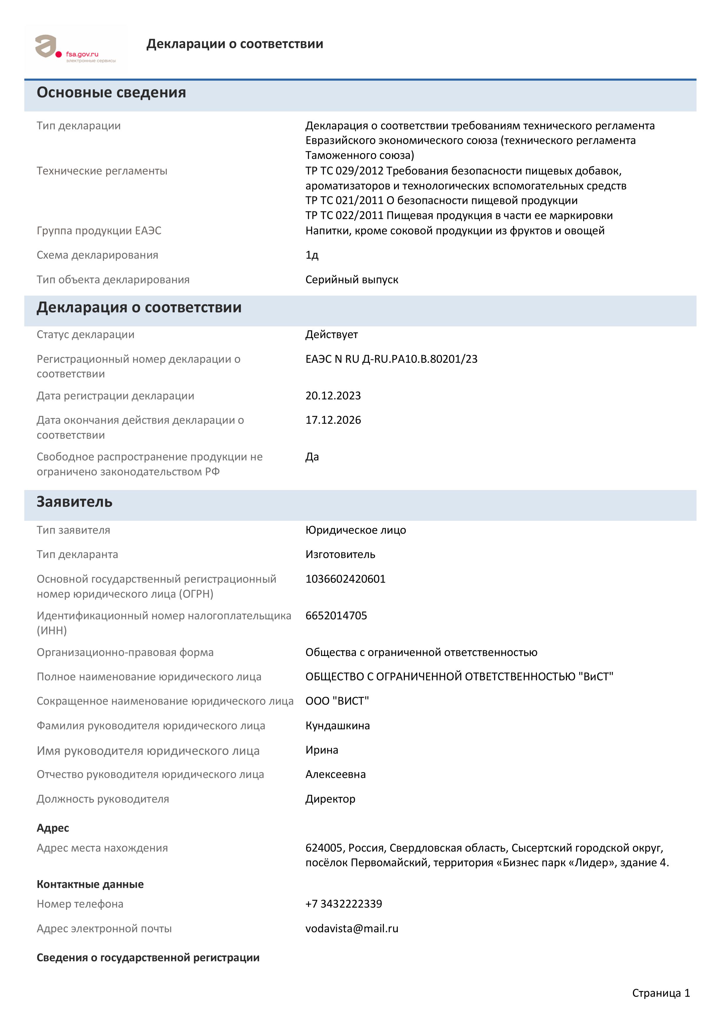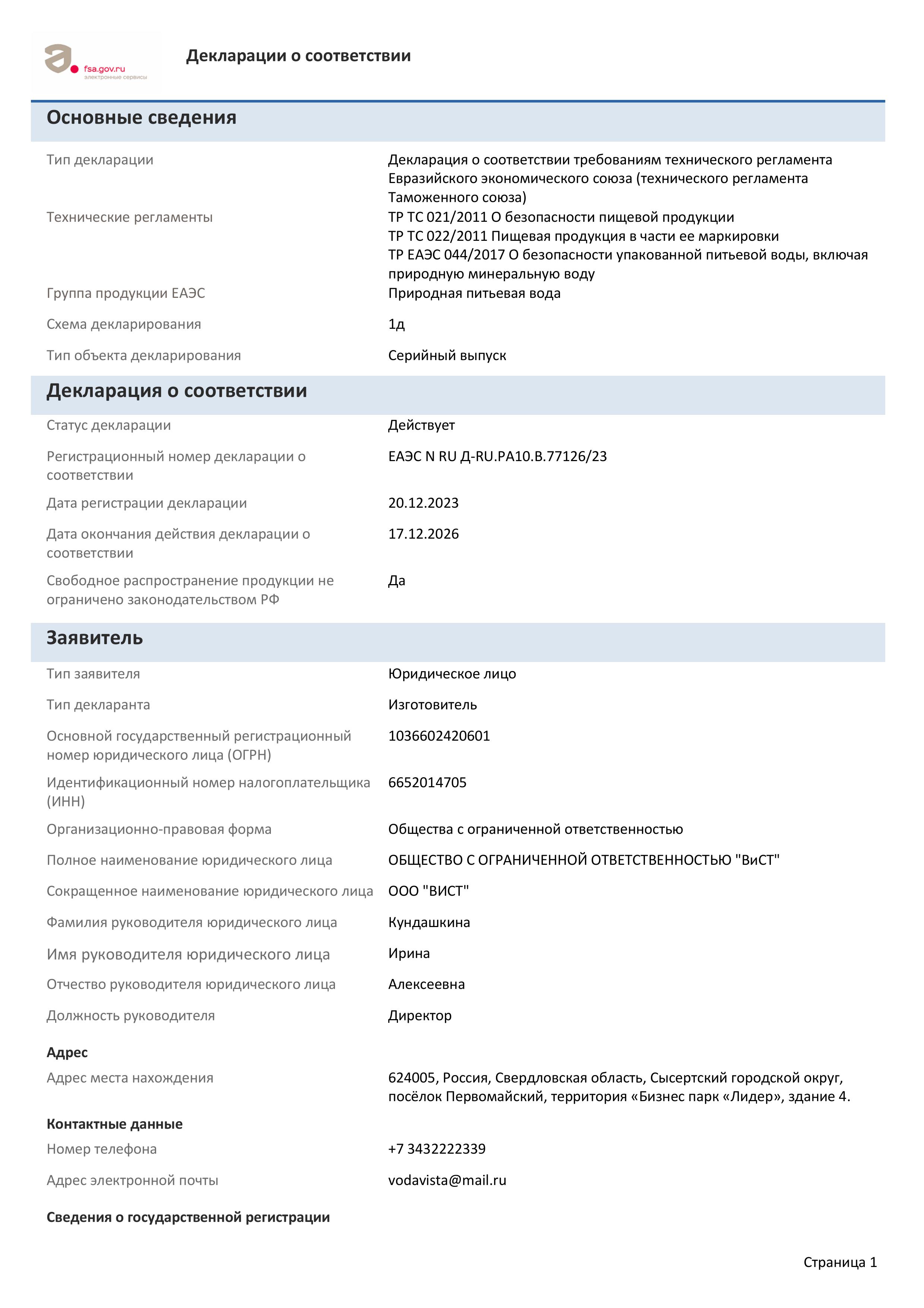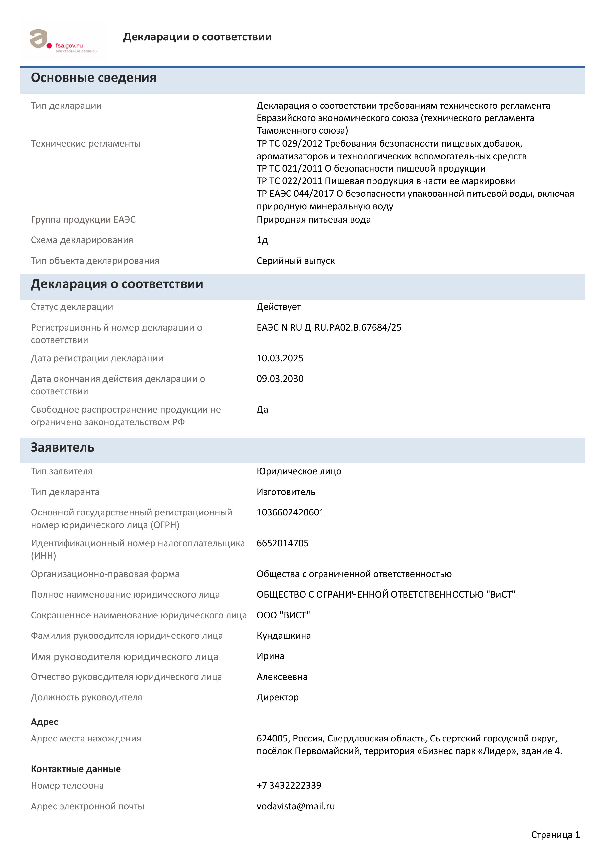 № РОСС RU.З2001. 04ИБФ1.ОСП28.71271 срок действия с 28.02.2025 по 27.02.2028 г. – «Вода питьевая «ВИСТА» негазированная, газированная в том числе с маркировкой «ВАУ!», «Вкус здоровья». Серийный выпуск.