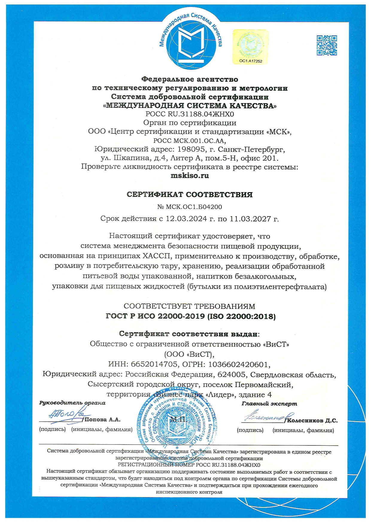 № МСК.ОС1. Б04200, срок действия с 12.03.2024 г. по 11.03.2027 г. СМБПП, основанная на принципах ХАССП, соответствует требованиям ГОСТ Р ИСО 22000-2019 (ISO 22000:2018)